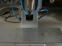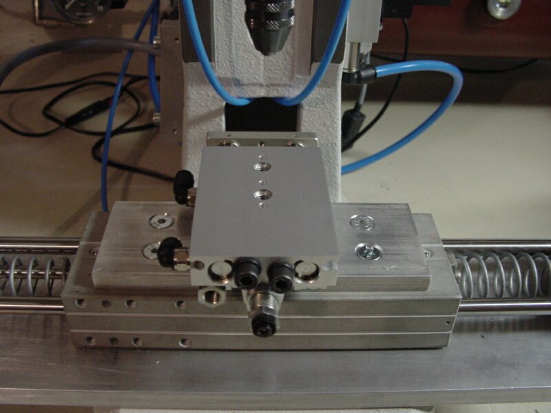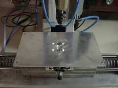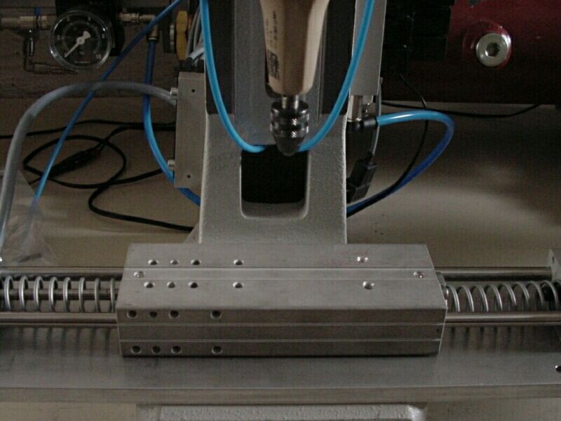 2 Der Schlitten für die X- Achse. Die Fe- dern dienten ursprünglich dazu, den Schlitten in der Mitte zu halten. Der geringe Versatz von 0.5mm kann vernachlässigt werden. Im späteren, pneumatischen Betrieb, werden noch einstellbare Anschläge hinzugefügt. |