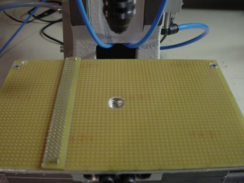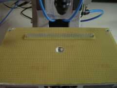 3 Darauf montiert, über eine zweite Spannplatte, der Y-Schlitten. Vorn befin- det sich der einstellbare Dämpfer. Über ihn wird der Schlitten mittig unter den Bohrer gebracht oder der Abstand der zu bohrenden Lochreihen zum Raster 2.54mm ausgeglichen. |