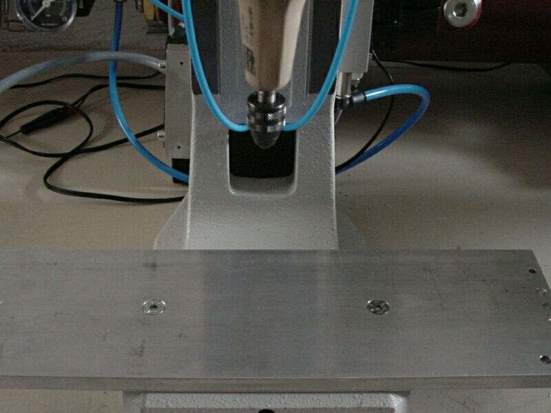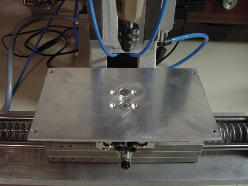 1 Die Grundplatte, 280 x 100 x 10mm, über Nutensteine in der Nut des Stand- fußes einer ehemaligen Handhebelpres- se befestigt und in X vermittelt. Die Mitte in Y wird durch die Senkkopfschrauben erreicht. |
