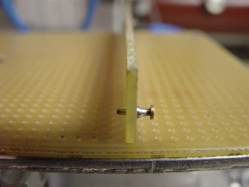 5 Die Lochrasterplatine wird jetzt zweck- entfremdet zum Abstecken benutzt. Der Anschlag wird in beide Richtungen und für verschiedene Positionen der zu bohr- enden Platine verwendet. Ist die erste Lochreihe ausgerichtet und gebohrt, wird um 2.54mm verschoben. So können z.B. die Löcher für einen 40er Wannen- stecker sauber gebohrt werden. |