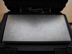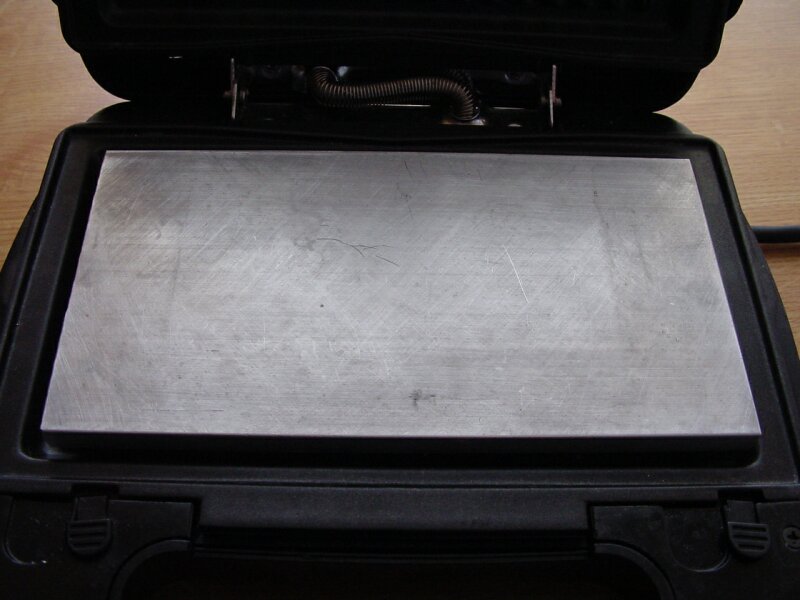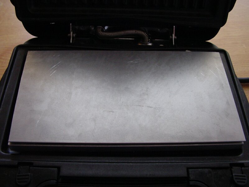 Die Bleche wurden ca.10min. vorgeheizt, der Vorgang selbst dauert ca. 3min. Der Grill hat 1000W, bei einem 2000er sollte das Layout noch besser aussehen und ich bräuchte nicht ganz so fest den Deckel anpressen. |