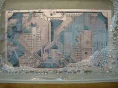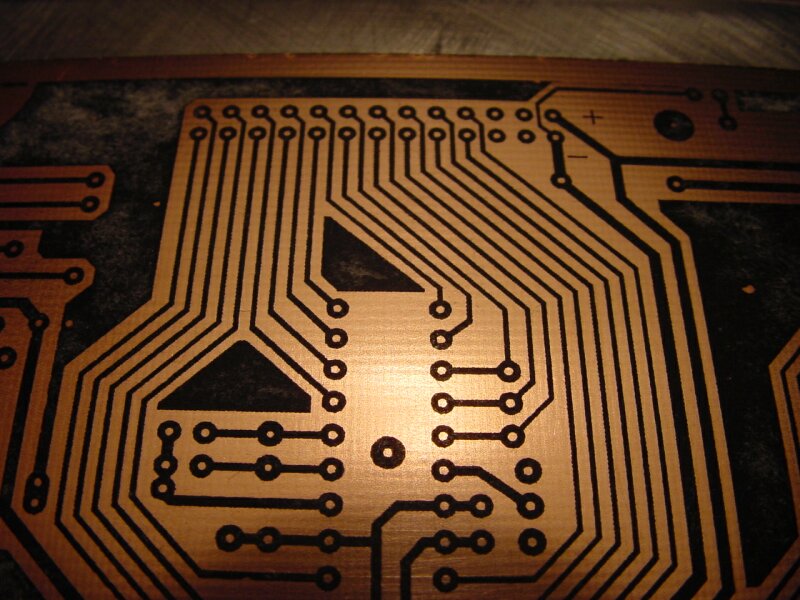 Etwas abkühlen lassen und dann das Papier in kaltem Wasser mit ein, zwei Tropfen Spülmittel ablösen. Nach ein paar Minuten kann das Papier vorsichtig mit den Fingern im Wasser abgerubbelt werden. Bleibt der Toner drauf und sind keine Unterbrecher zu sehen, kann geätzt werden. |