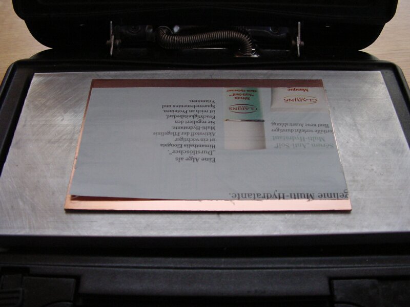 Das Kupfer muß gut mit Aceton von Schmutz und Fett befreit werden. Achtung: Schutzhanschuhe tragen, sonst sind die Finger auch fettfrei! |