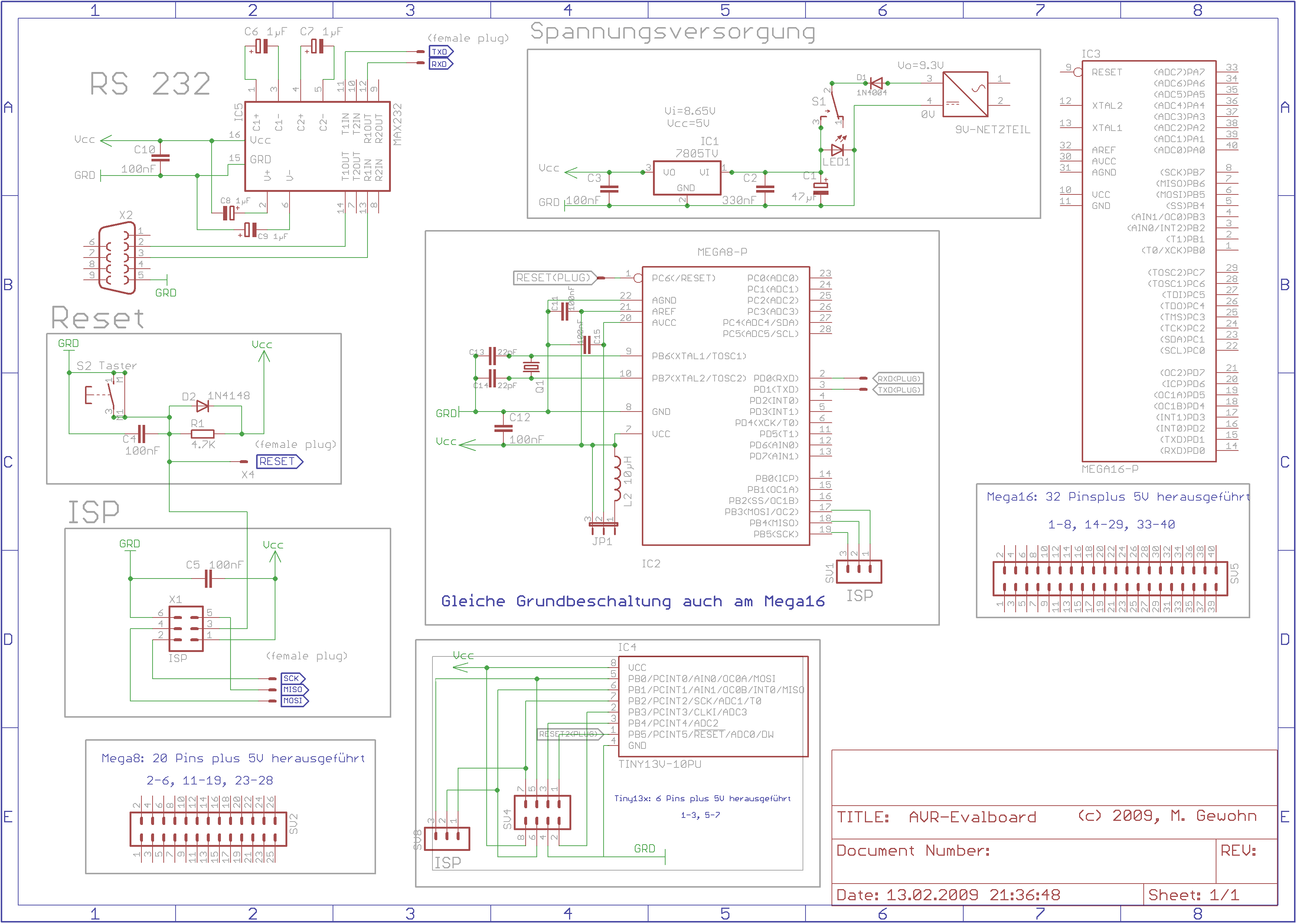 Nach meinem Einstieg in die Welt der Atmel®- Mikrocontroller und der Elektronik stand schnell fest, daß ich das Programmierboard selbst herstellen würde. Der Hintergrund war die Entwicklung einer Steuerung für eine Slotcar- Bahn. Mittlerweile bin ich jedoch zum Hobby und dem Bau einer Modelleisenbahn zurückgekehrt - es wird eine Anlage in Spur Z entstehen. Es sollen ATmega8, ATmega16 und ATtiny's in Print-/SMD- Ausführung zum Einsatz kommen. Als Besonderheit habe ich einen SMD- Adapter entworfen, um auch die kleinen Achtbeiner zu programmieren. Mehrfaches Ein- und Auslöten könnte sie zerstören; für einen ISP- Anschluß wird nicht immer Platz sein. Einige kleine Platinen sind mit dem Bügeleisen recht gut gelungen. Für grössere PCB ist dieses Verfahren jedoch ungeeignet. So kam ich auf die Idee, die Platinen mit einem Kontaktgrill herzustellen. Doch fangen wir am Anfang an. Der Programmer dazu ist ja schon fertig; mein AVR®- Board dient hier als Beispiel. |